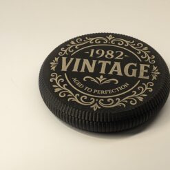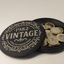 Celebrate a special milestone with this unique personalised coaster – a thoughtful gift with a hidden twist. Engraved with your chosen year and the phrase “Aged to Perfection”, this sleek design hides a discreet storage compartment, perfect for sweets, biscuits, or small keepsakes.