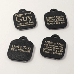 These compact keychain tags are both stylish and practical. Whether you’re organising your keys, tagging school bags, or adding contact info to a pet collar, these personalised black and silver tags help you stay organised and identifiable.