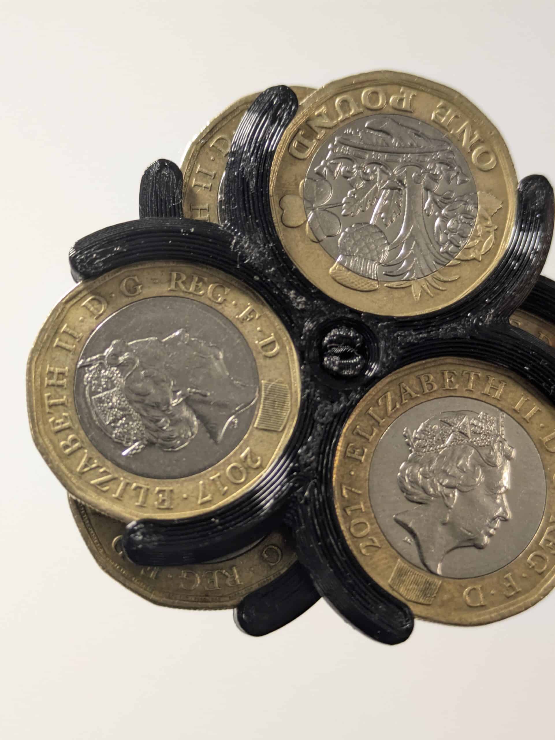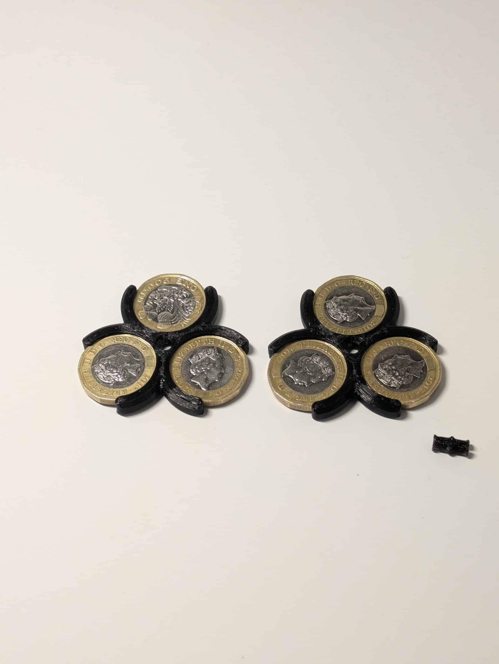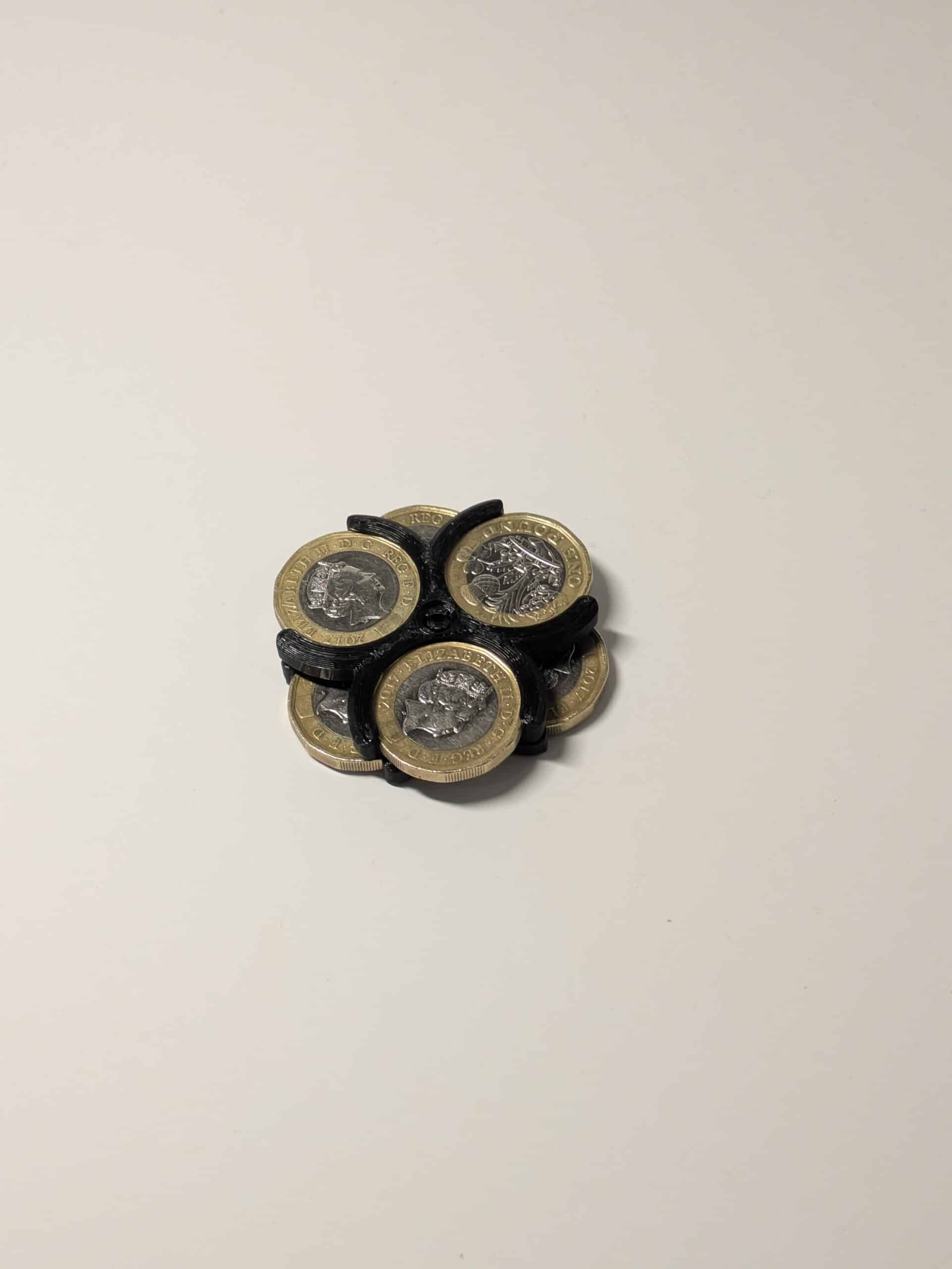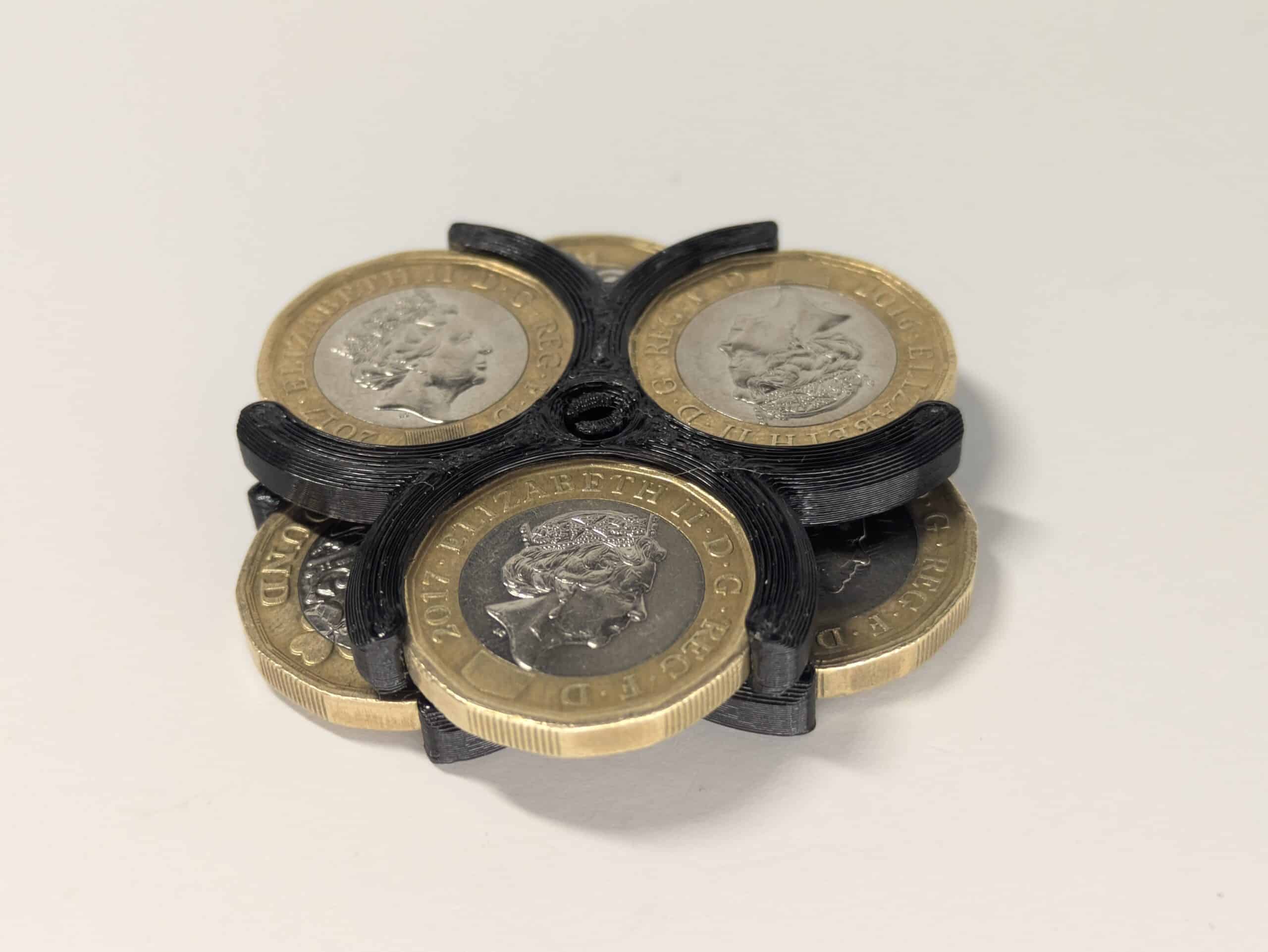 Each £3 Flex Click Coin Holder measures approximately 45mm across and 5mm deep, perfectly shaped to hold three £1 coins in a precision circular arrangement. When connected via the supplied modular click connector, both holders swivel around a central pivot, maintaining easy access to your coins while doubling capacity to £6.
