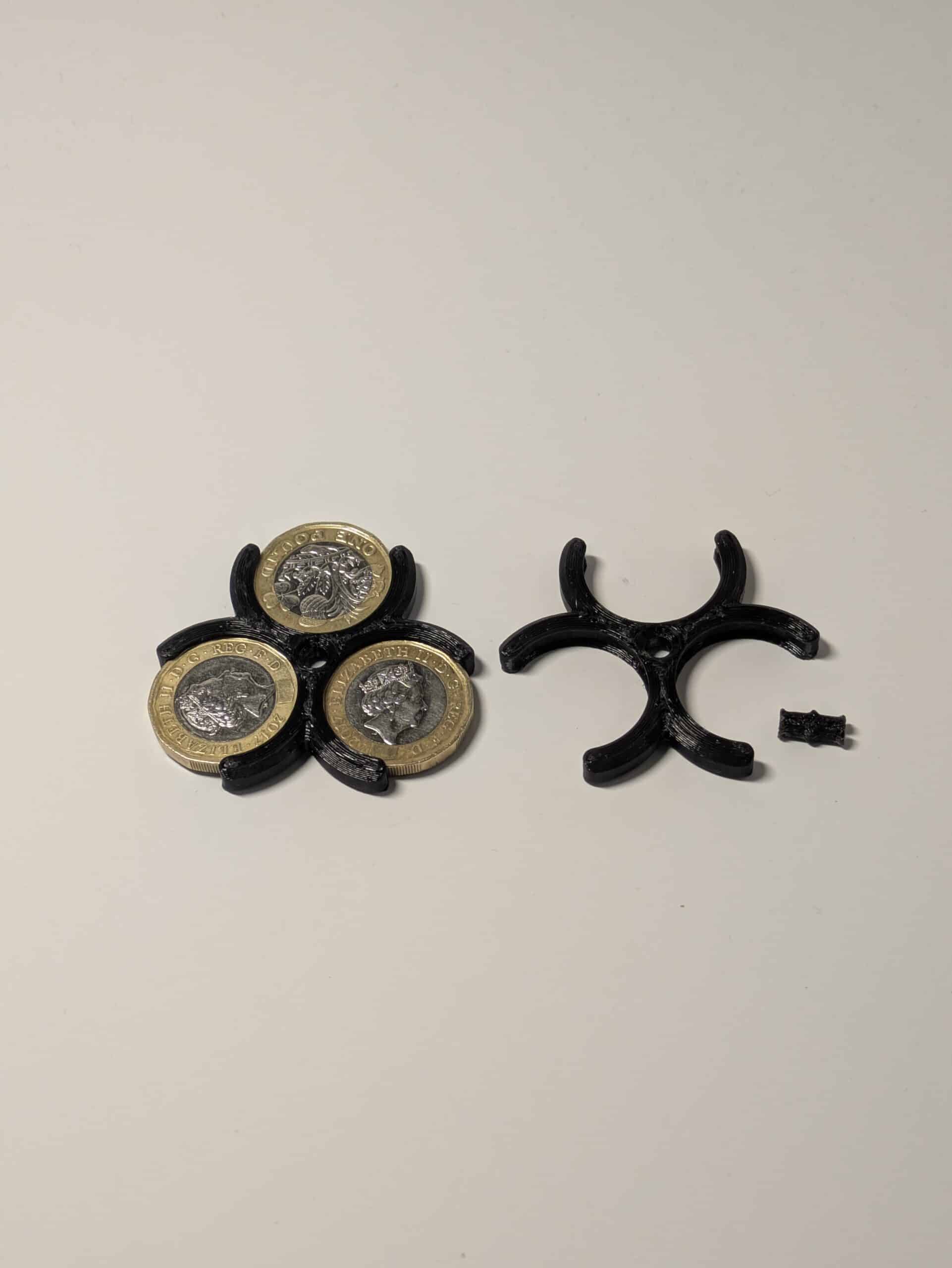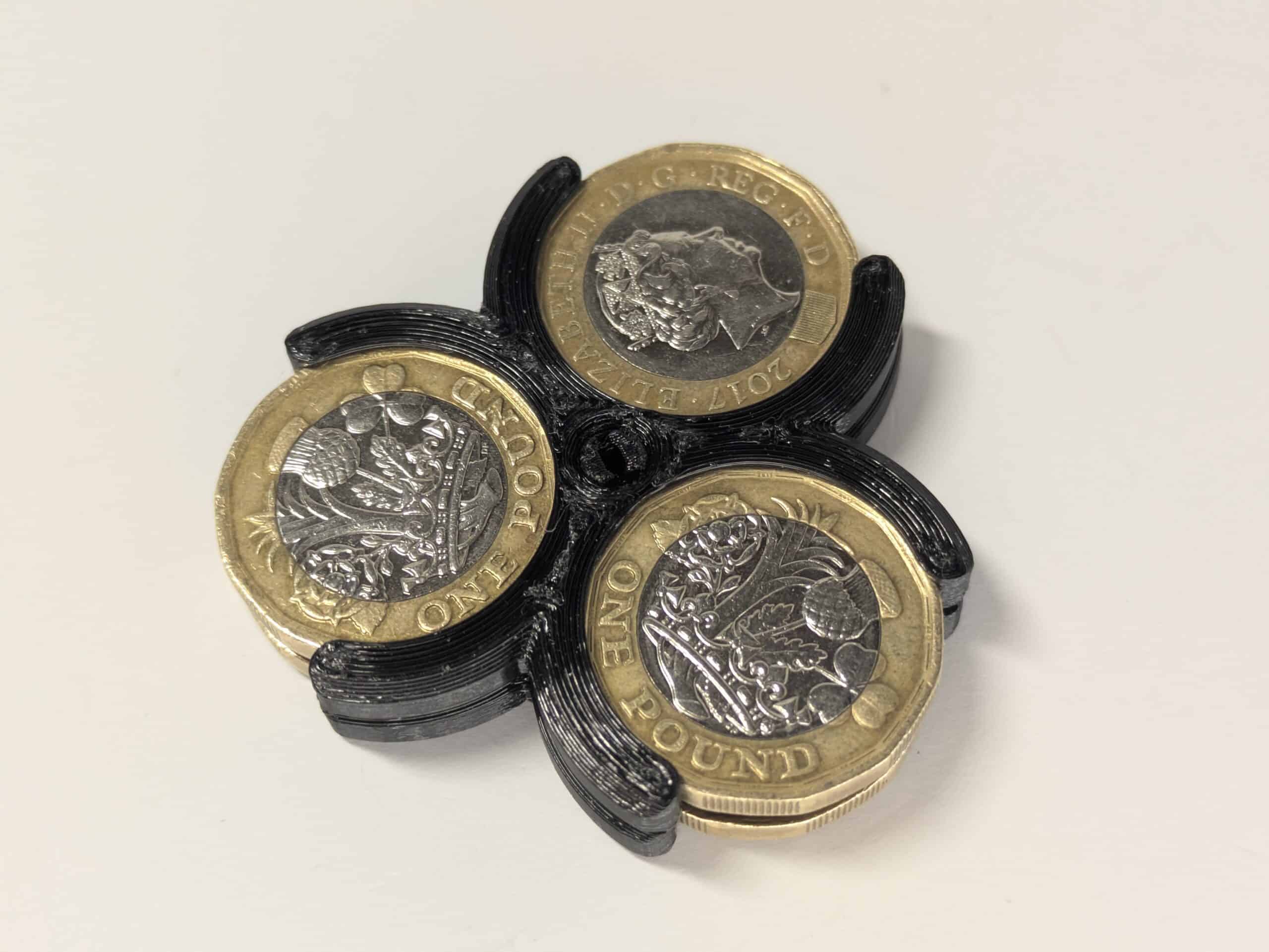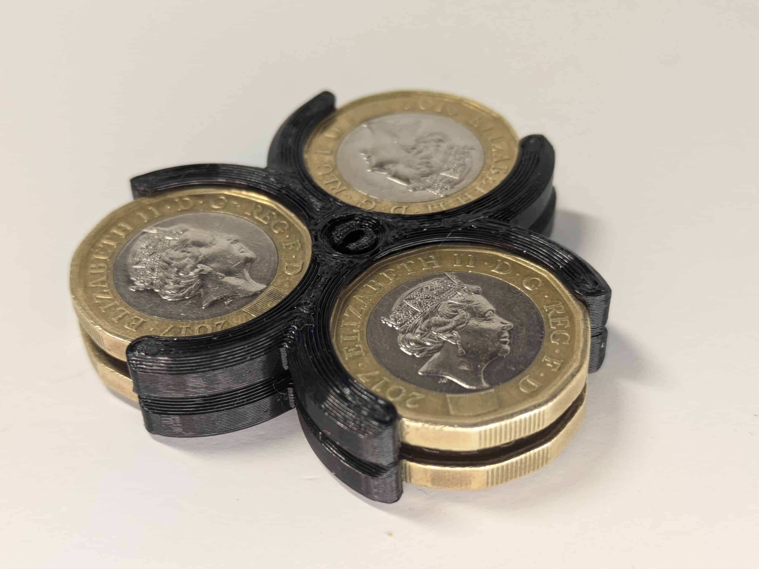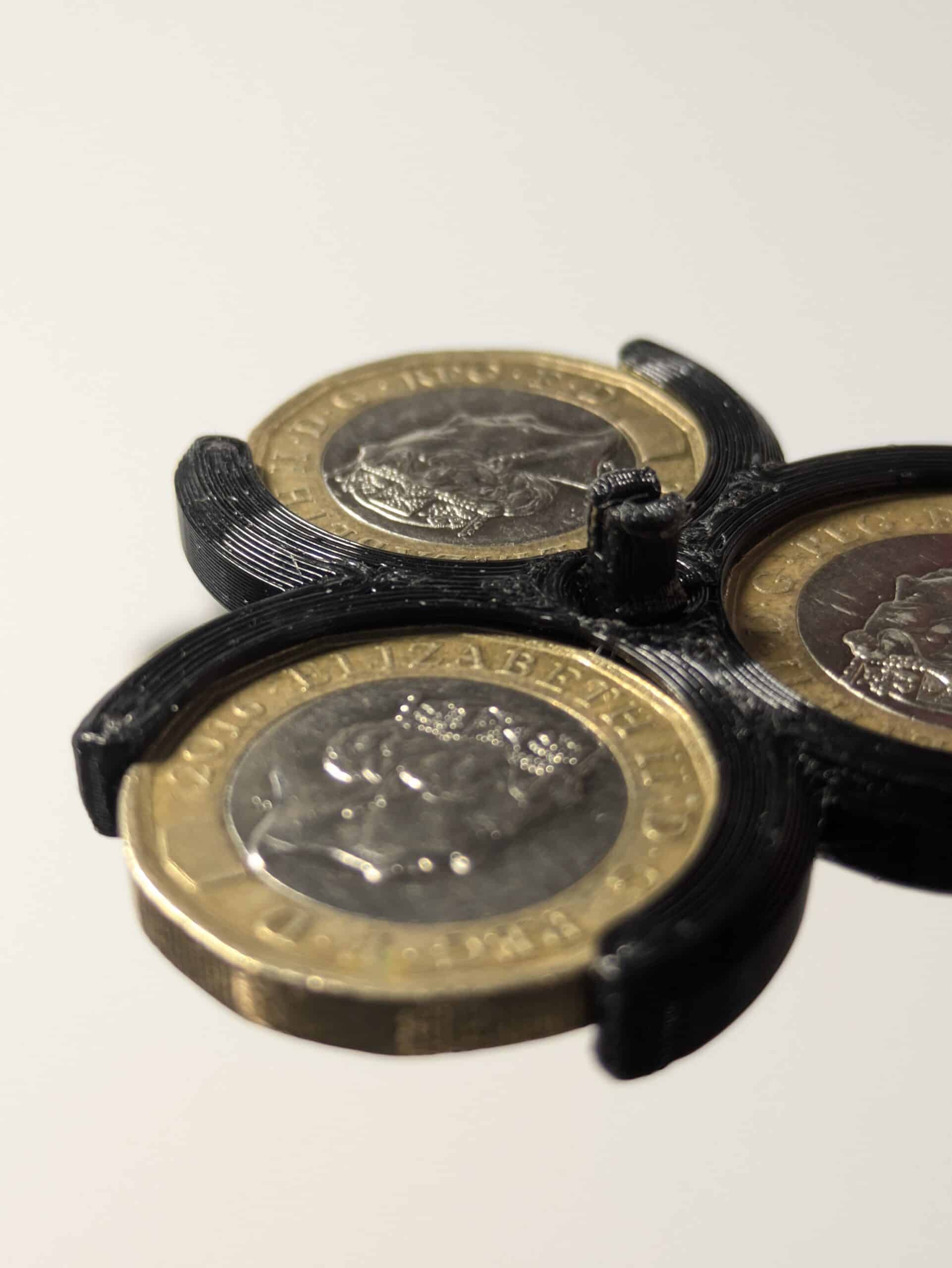 Each £3 Flex Click Coin Holder measures approximately 45mm across and 5mm deep, perfectly shaped to hold three £1 coins in a precision circular arrangement. When connected via the supplied modular click connector, both holders swivel around a central pivot, maintaining easy access to your coins while doubling capacity to £6.