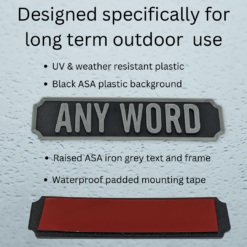 These signs are 3D printed in ASA, a durable material known for its superior UV resistance, weatherproofing, and heat tolerance, making it ideal for long-term outdoor use. Each sign features a black background with an iron grey font and vintage-style frame for a classic look.